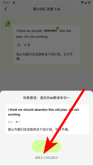4、完成当前句子练习后,点击继续下一句对话练习,继续进行后续口语学习训练。