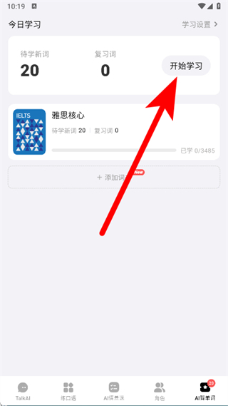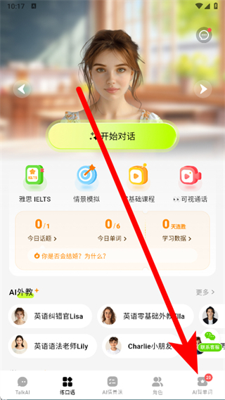 1、打开Talkai练口语,点击底部导航栏AI背单词,进入单词学习页面。