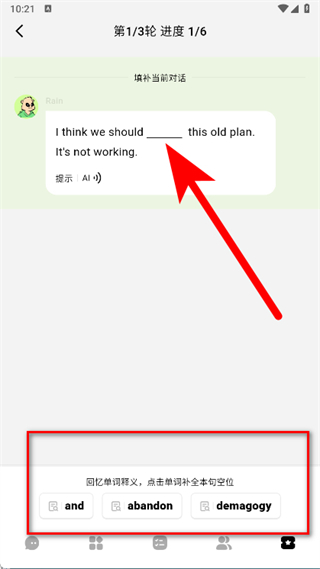 3、进入单词练习环节后,根据题目提示,从下方选项中选择正确单词。