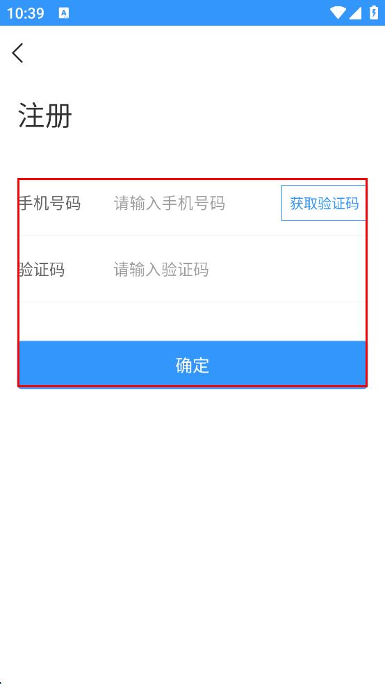 4、在注册页面,输入手机号码,点击获取验证码并输入验证码,点击确定按钮。