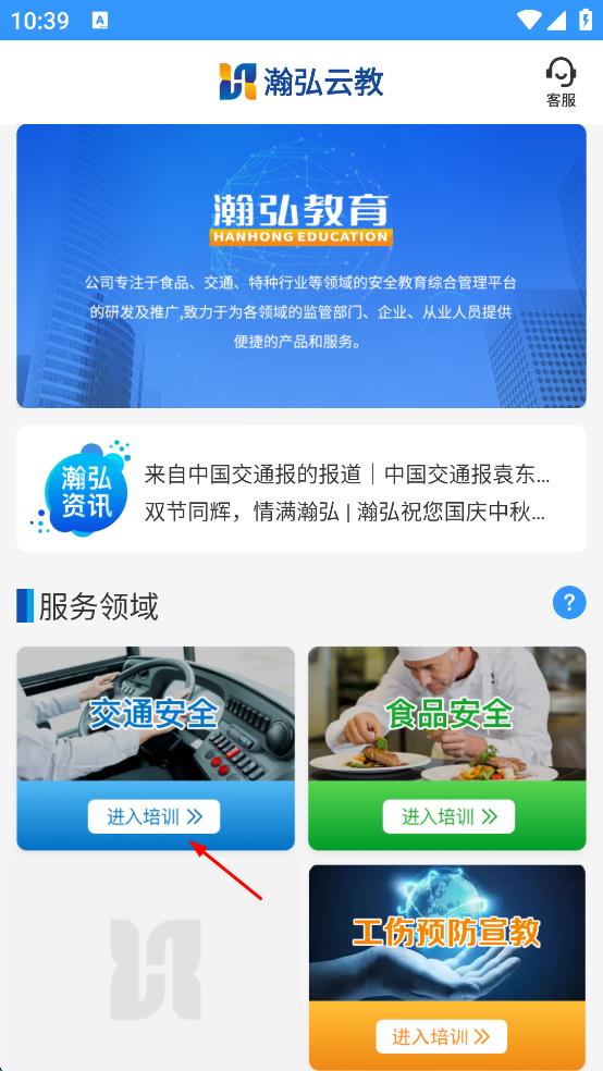 1、打开瀚弘云教APP,在首页服务领域板块,点击交通安全对应的进入培训按钮。