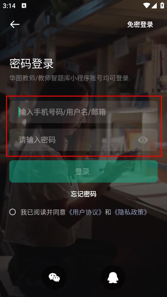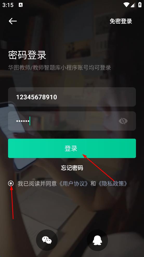 3、在密码登录页面输入手机号码或用户名、邮箱,再输入密码,勾选已阅读并同意相关协议。