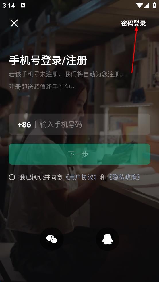 2、在登录相关界面,点击右上角“密码登录”,进入密码登录页面。