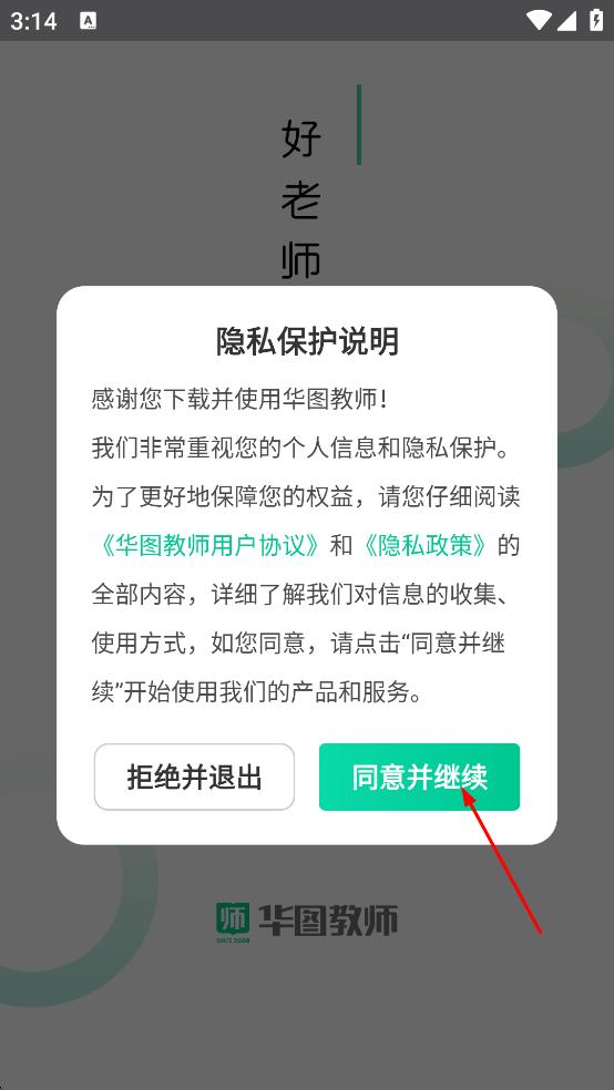 1、打开华图教师,弹出隐私保护说明,点击同意并继续,进入登录相关界面。