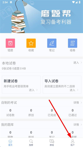 1、打开磨题帮app,点击底部导航栏中的账户选项,进入账户相关页面。