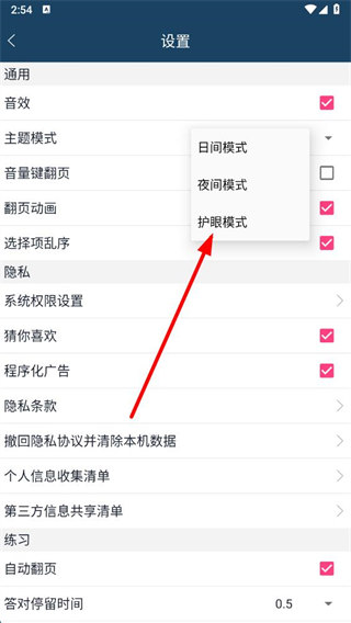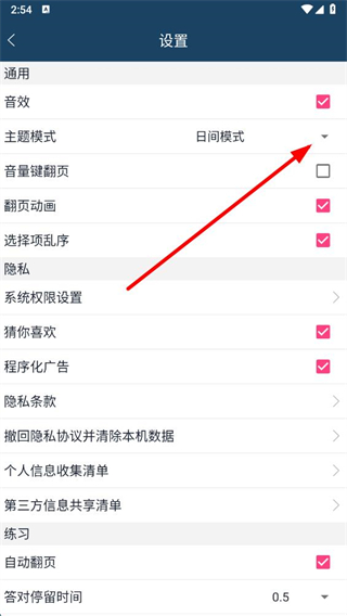 3、在设置界面中,找到主题模式选项,点击其右侧的下拉箭头。