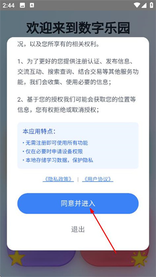 1、在欢迎来到数字乐园弹窗中,点击同意并进入,进入主界面。
