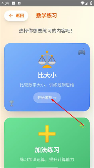 3、在数学练习选择页面,点击比大小下方的开始游戏,进入比大小游戏页面。