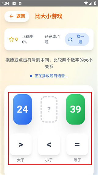 4、根据题目提示,拖拽或点击符号到中间,比较两个数字的大小关系。
