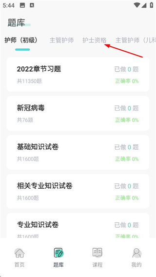 2、在题库页面,点击护士资格,切换到护士资格题库分类。