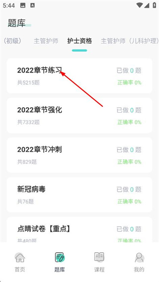 3、在护士资格题库分类下,点击2022章节练习,进入该练习的题目页面。