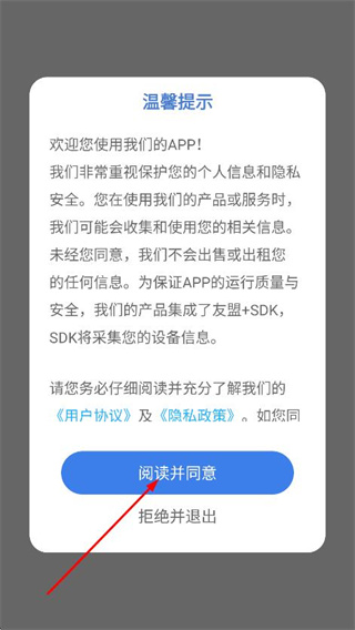1、在温馨提示弹窗中,点击阅读并同意,进入APP主界面。