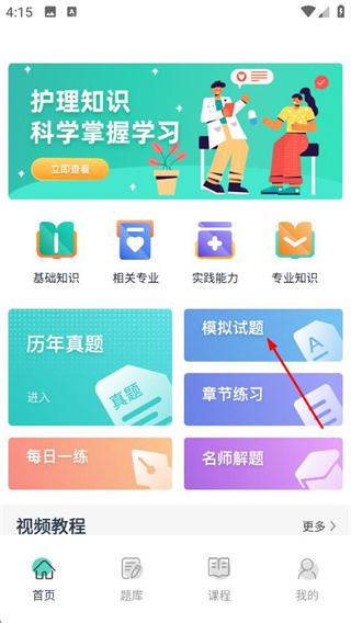 2、在应用的主界面,点击模拟试题,进入模拟试题列表页面。