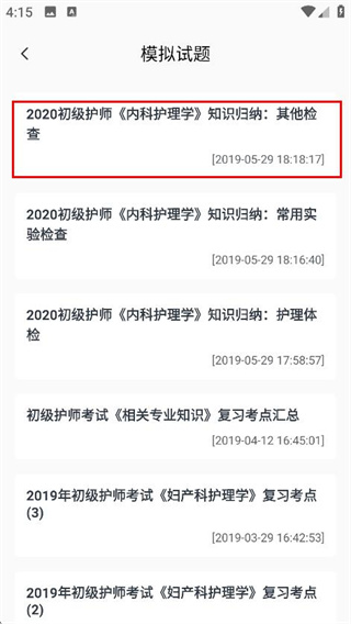 3、在模拟试题列表页面,点击2020初级护师,进入该试题详情页面。