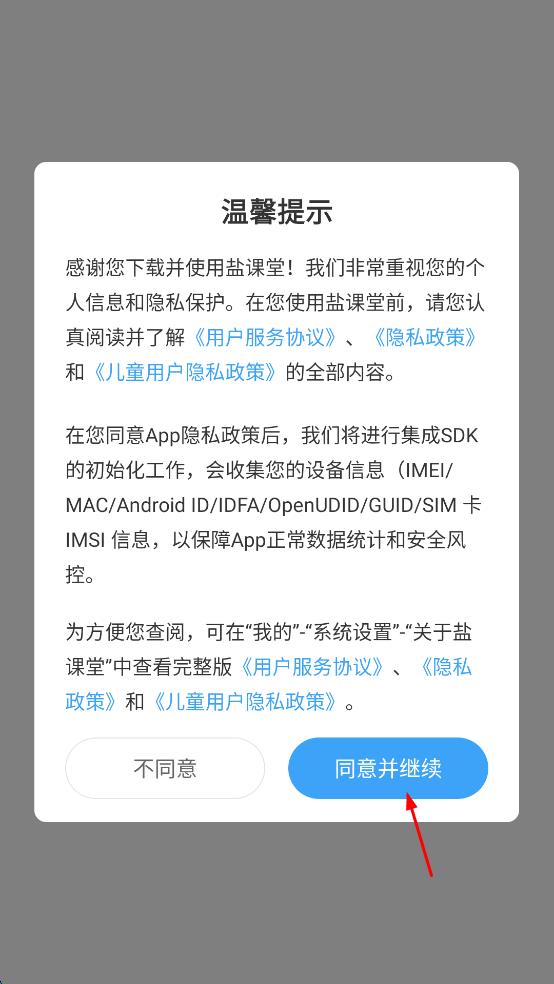1、打开盐课堂,在弹出的温馨提示页面,点击同意并继续,进入盐课堂选课页面。