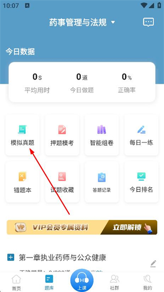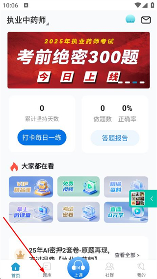 1、在执业中药师页面,点击底部题库,进入题库页面。