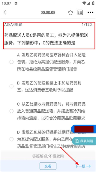 4、在真题答题页面,可作答题目,还能点击下一题继续答题。