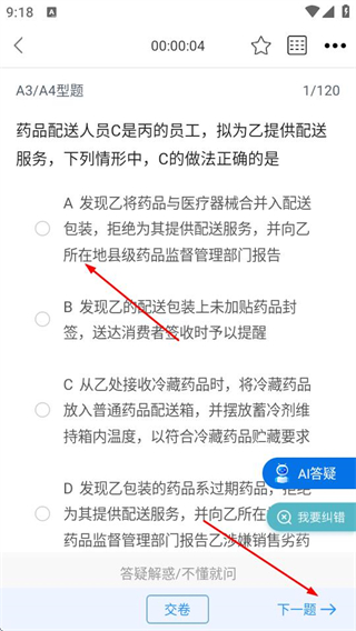 4、进入做题界面后,选择认为正确的答案选项,点击下一题继续答题。