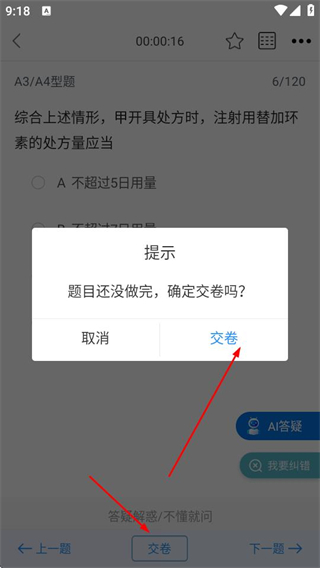 5、结束答题,点击底部的交卷按钮,在弹出的提示框中再次点击交卷,完成本次做题。