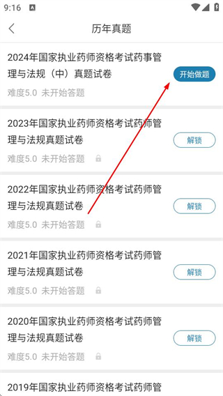 3、在历年真题列表中,找到可做的真题试卷,点击开始做题。