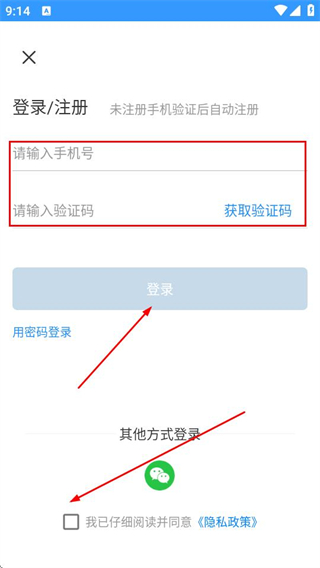 4、输入手机号码,获取验证码,勾选隐私政策,点击登录按钮。