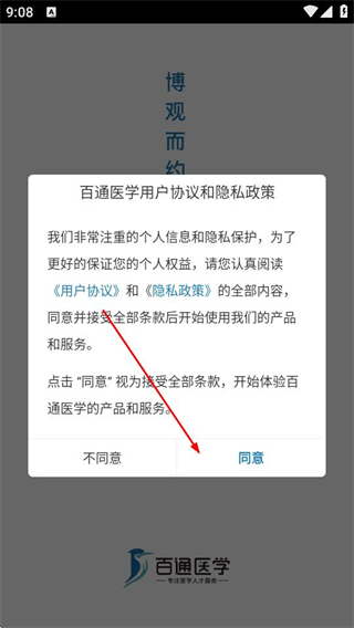 1、打开百通医学APP,在弹出的百通医学用户协议和隐私政策界面,点击同意。