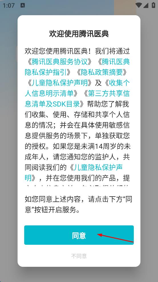 1、打开腾讯医典,在弹出的服务协议等提示页面,点击同意,进入腾讯医典首页。