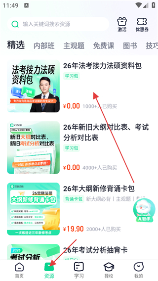 2、点击资源,用户可以找到各种法硕学习资料包,包括法考接力法硕资料、新旧大纲对比表等,部分资料可免费获取。
