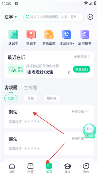3、点击学习,涵盖客观题和主观题,方便用户进行不同类型的题目练习,还能记录做题情况,收藏题目。