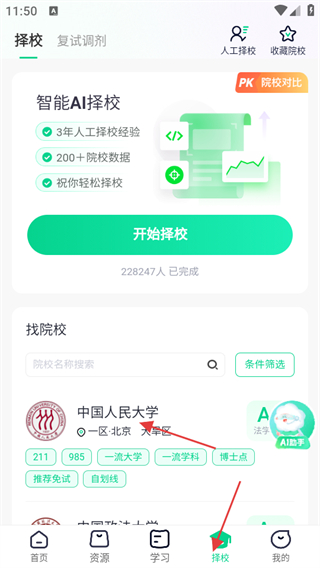 4、点击择校,帮助用户轻松择校,还可以进行院校对比,搜索院校名称或通过条件筛选查找目标院校。