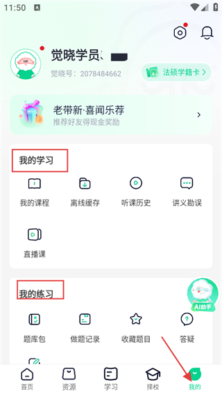 5、在我的页面,设有我的学习和我的练习板块,支持管理我的课程、离线缓存课程、查看听课历史、讲义勘误、使用题库包、查看做题记录等。