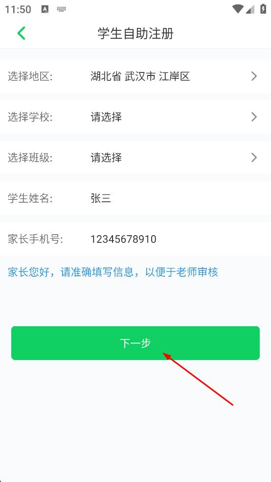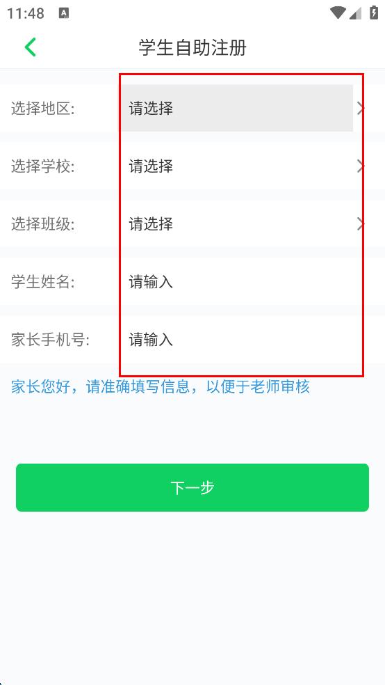 3、在学生自助注册页面,选择地区、学校、班级,输入学生姓名、家长手机号。