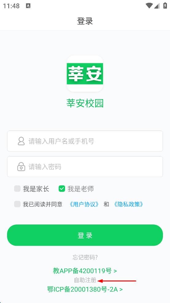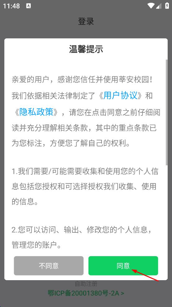 1、打开莘安校园,在弹出的温馨提示页面,点击同意,进入登录页面。