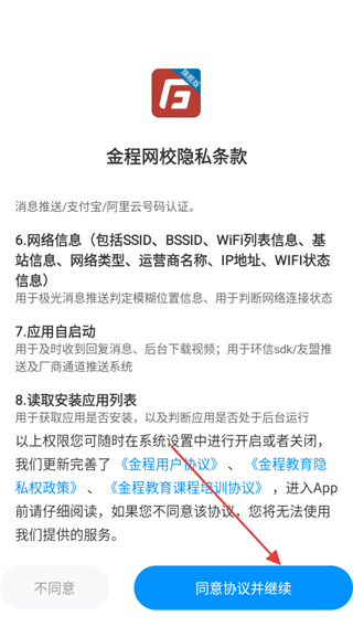 1、打开金程网校旗舰版APP,在金程网校隐私条款界面,点击同意协议并继续。