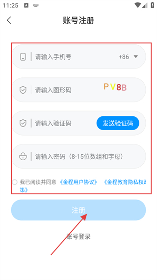 4、在账号注册页面,依次输入手机号、图形码,输入验证码,设置密码,勾选协议,点击注册。