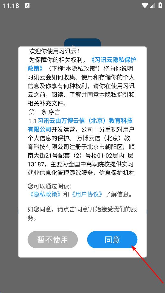 1、打开习讯云,在弹出的隐私保护政策页面,点击同意,进入学校选择页面。