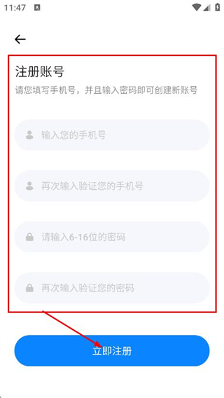 4、填写手机号、密码等信息后,点击立即注册,完成账号注册。