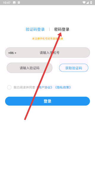 1、在进入到登录界面中时,可以点击上方密码登录按钮,切换登录方式。