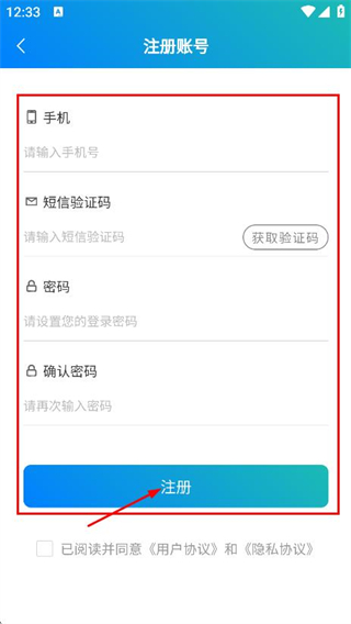 4、填写手机号、短信验证码、密码等信息后,点击注册,完成账号注册。