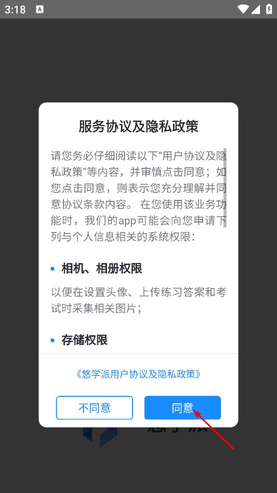 1、打开悠学派,在弹出的服务协议及隐私政策页面,点击同意,进入悠学派登录页面。