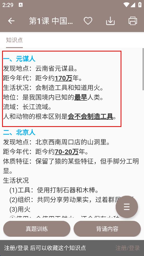 4、在第1课知识点页面,即可查看元谋人等相关知识点内容。