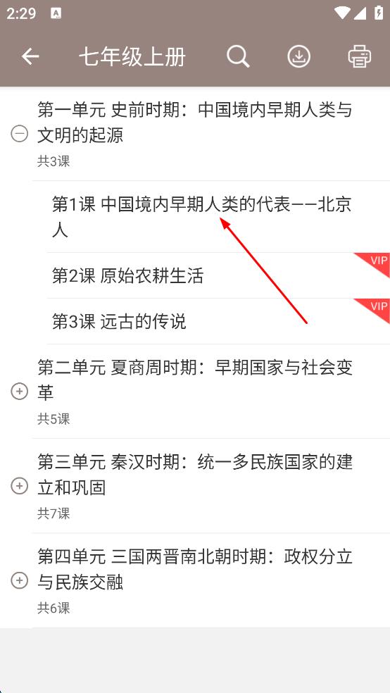3、在七年级上册内容页面,点击第1课“中国境内早期人类的代表——北京人”,进入该课知识点页面。
