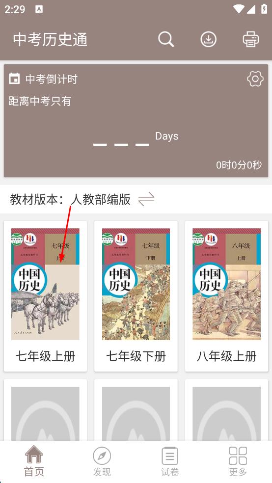 2、在中考历史通首页,选择教材版本为“人教部编版”,点击七年级上册教材封面,进入七年级上册内容页面。
