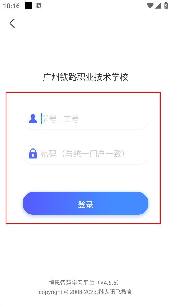 4、在院校登录页面,依次输入学号或工号以及与统一门户一致的密码,点击登录按钮。
