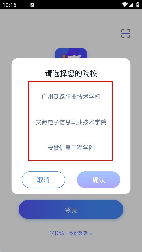 2、在登录界面,点击下方学校统一身份登录选项,弹出请选择您的院校弹窗。