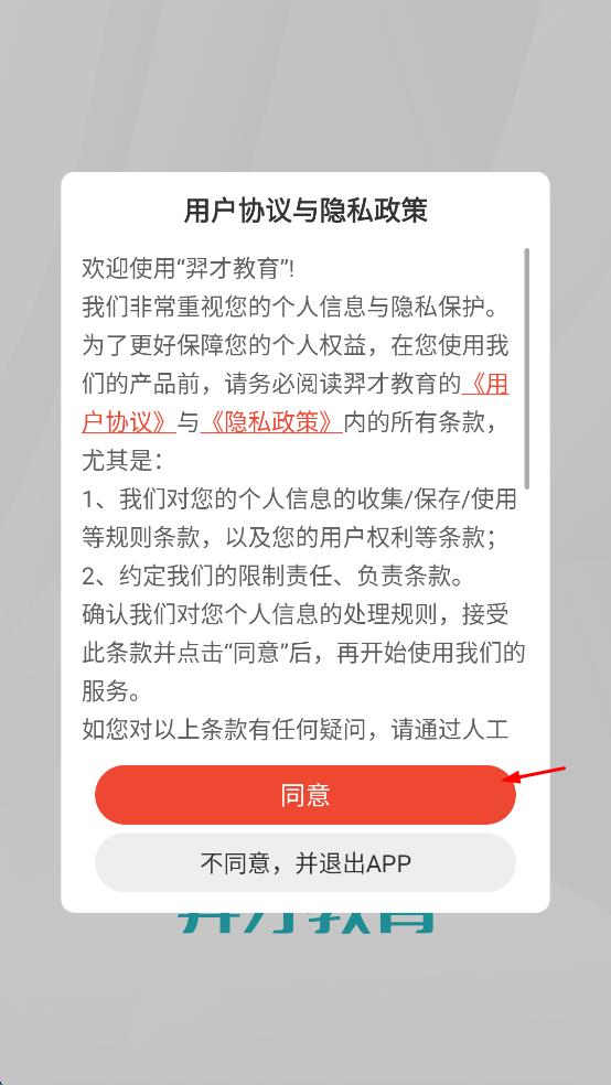 1、打开羿才教育软件,出现用户协议与隐私政策提示框,点击同意。