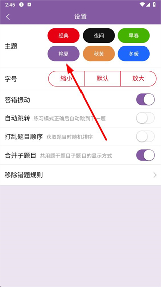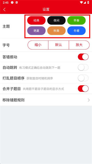 3、在设置界面中,找到主题选项,会看到多种颜色主题,如经典、夜间、早春等。