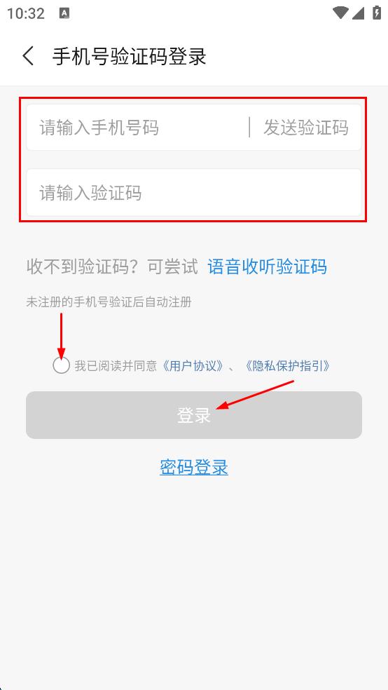 4、在手机号验证码登录界面,输入手机号码和验证码,勾选已阅读并同意相关协议后,点击“登录”按钮,完成登录操作。