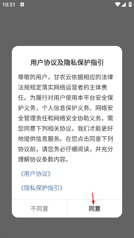 1、打开甘农云APP,在弹出的用户协议及隐私保护指引页面,点击“同意”按钮,进入APP主界面。