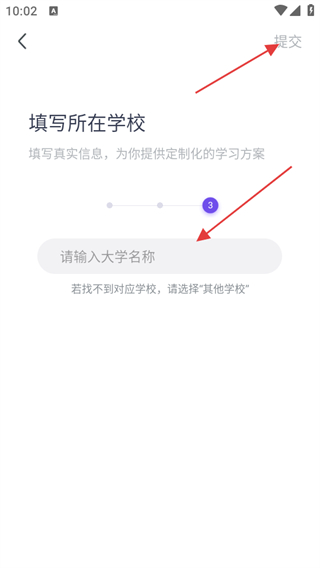 4、在填写所在学校界面,在输入框中填写你的大学名称,点击右上角提交,完成注册流程。